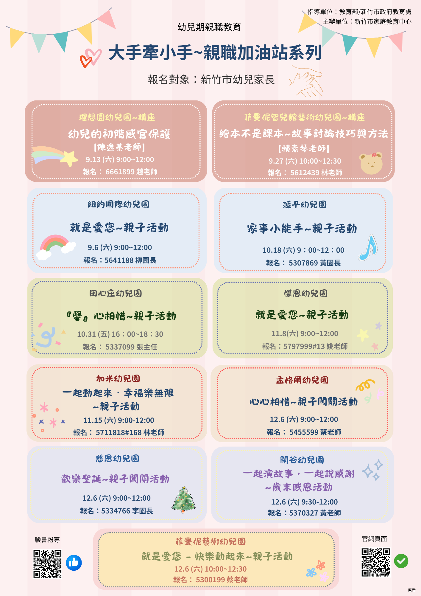 轉知:新竹市家庭教育中心辦理114年【9-12月】幼兒期親職教育-大手牽小手~親職加油站系列💕