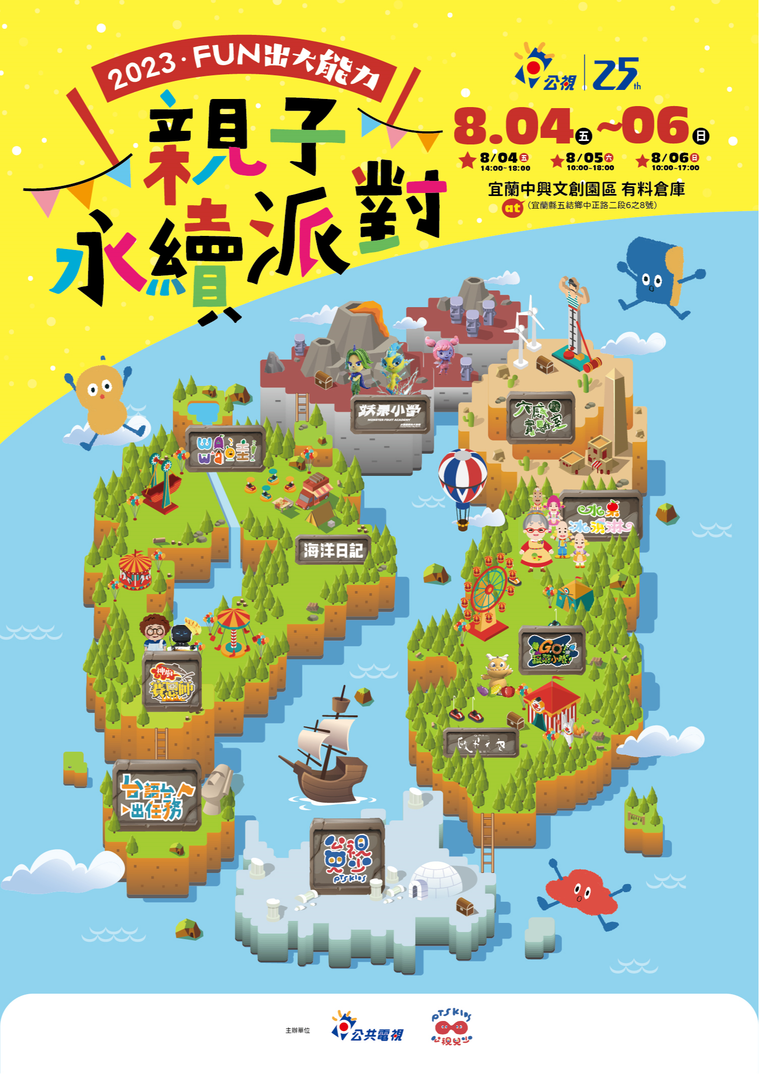 一、 公視一直努力製播許多優質節目,提供給兒少觀眾族群,希望以寓教於樂的方式陪伴孩子成長!今年繼續推出公視兒少年度活動【FUN出大能力】親子永續派對,8/4(五)-8/6(日)三天,在「宜蘭中興文創園區 有料倉庫」(地址:宜蘭縣五結鄉中正路二段6之8號)舉辦,讓孩子可以從玩樂中學習。